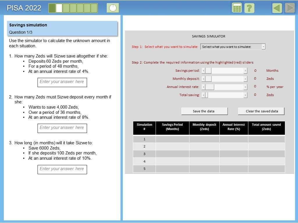 สำหรับใครที่ไม่เคยได้ยินมาก่อน ข้อสอบคณิตศาสตร์ของ PISA ไม่ใช่ข้อสอบคณิตศาสตร์แบบที่เราคุ้นเคยกัน นั่นคือมันไม่ได้วัดว่าคุณรู้สูตรเยอะแค่ไหน จัดรูปเก่งรึเปล่า หรือคิดเลขถูกมากแค่ไหน แต่มันวัดการใช้ ว่าคุณสามารถเอาคณิตศาสตร์ไปใช้ได้ดีแค่ไหน ลองดูตัวอย่างโจทย์ในรูปนี้ สิ่งที่โจทย์ให้มาคือโปรแกรมสำเร็จรูปสำหรับการคำนวณเงินฝากที่ผู้เข้าสอบต้องลองกดเล่นเองเพื่อตอบคำถาม ไม่ต้องจำสูตร ไม่ต้องท่องอะไรมา แค่อ่านสิ่งที่อยู่ตรงหน้า เล่นเครื่องมือที่เขามีให้ แล้วตอบคำถาม